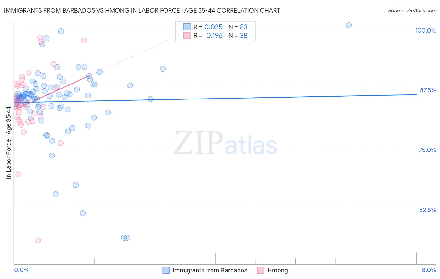 Immigrants from Barbados vs Hmong In Labor Force | Age 35-44 Correlation Chart