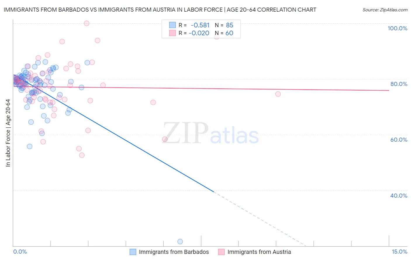 Immigrants from Barbados vs Immigrants from Austria In Labor Force | Age 20-64 Correlation Chart
