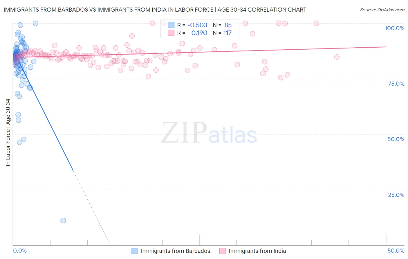 Immigrants from Barbados vs Immigrants from India In Labor Force | Age 30-34 Correlation Chart