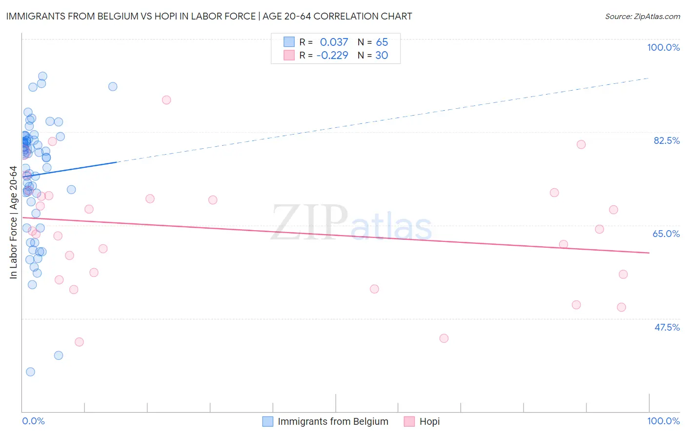 Immigrants from Belgium vs Hopi In Labor Force | Age 20-64 Correlation Chart