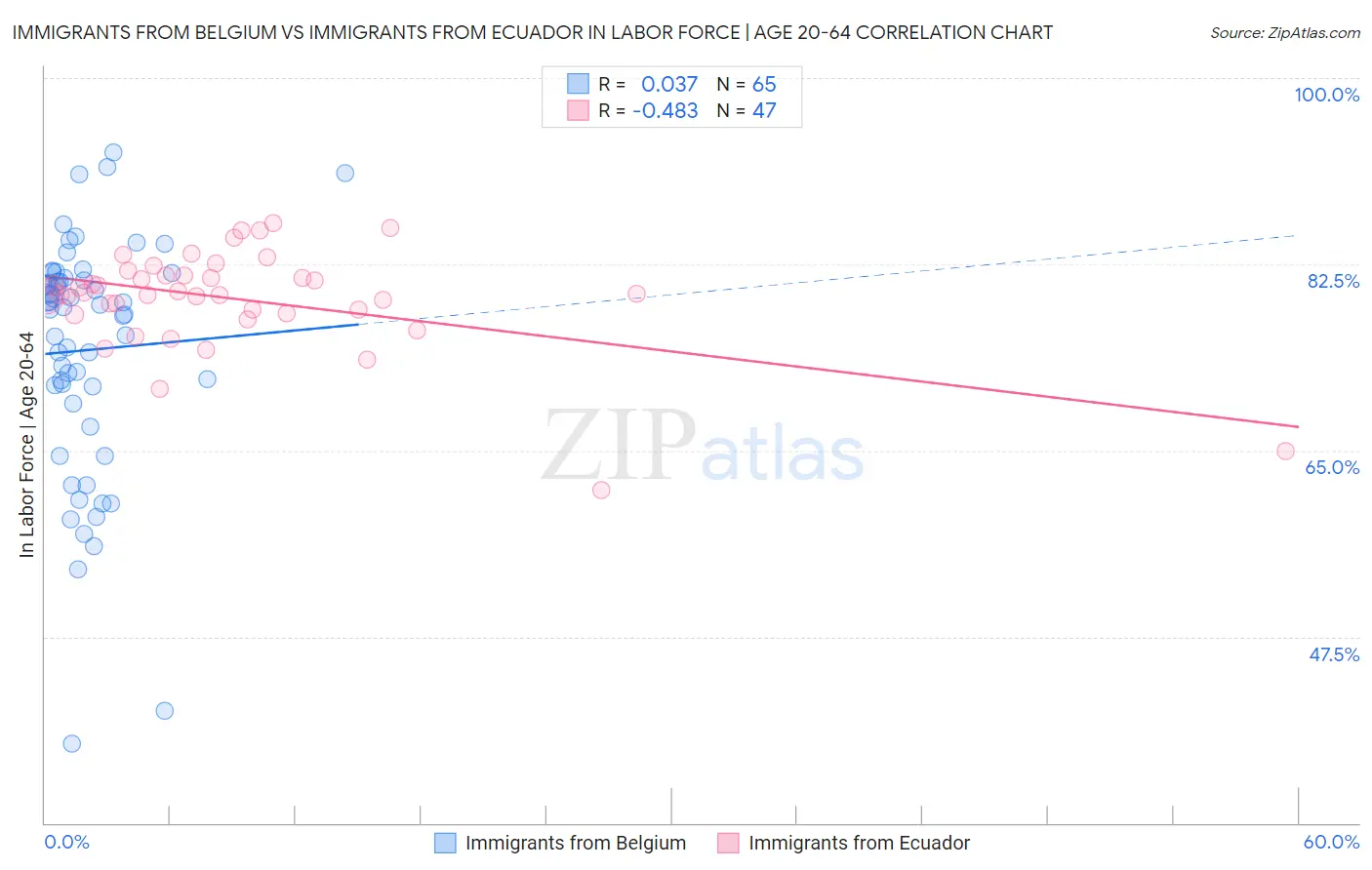 Immigrants from Belgium vs Immigrants from Ecuador In Labor Force | Age 20-64 Correlation Chart
