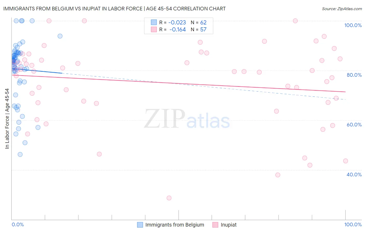 Immigrants from Belgium vs Inupiat In Labor Force | Age 45-54 Correlation Chart
