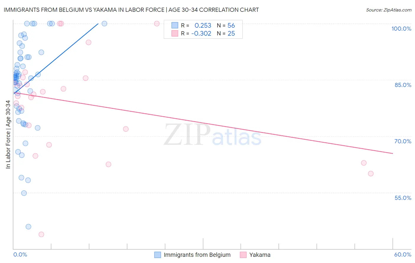 Immigrants from Belgium vs Yakama In Labor Force | Age 30-34 Correlation Chart