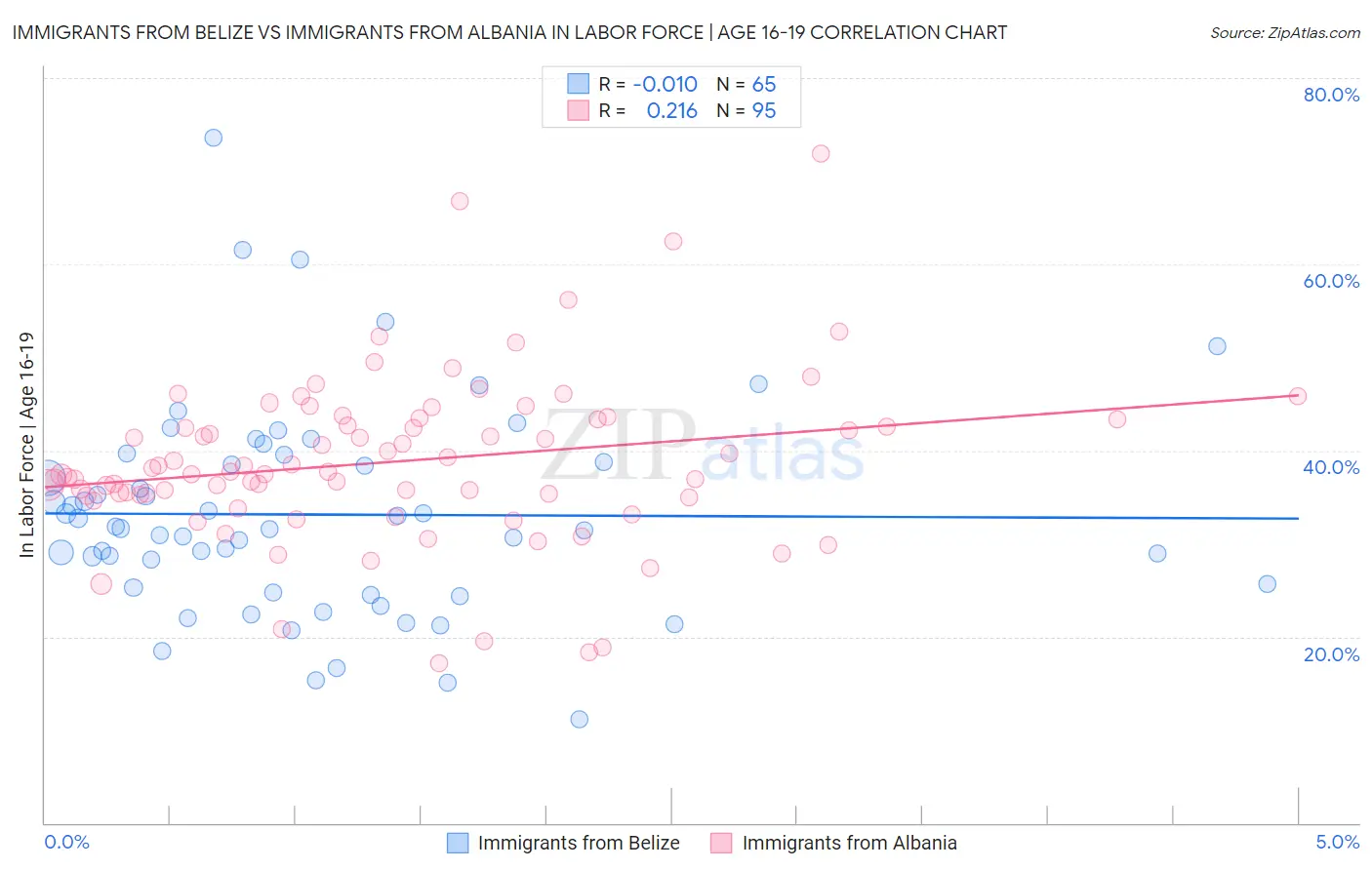 Immigrants from Belize vs Immigrants from Albania In Labor Force | Age 16-19 Correlation Chart