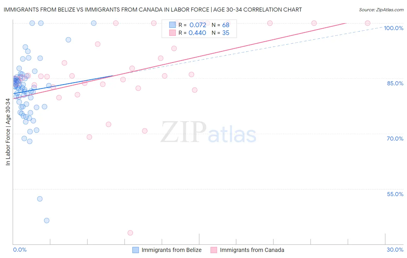 Immigrants from Belize vs Immigrants from Canada In Labor Force | Age 30-34 Correlation Chart