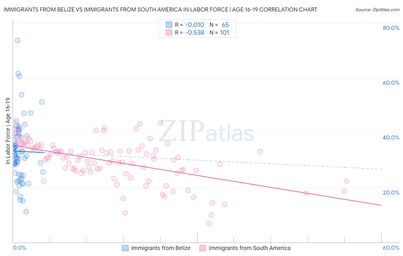 Immigrants from Belize vs Immigrants from South America In Labor Force | Age 16-19 Correlation Chart