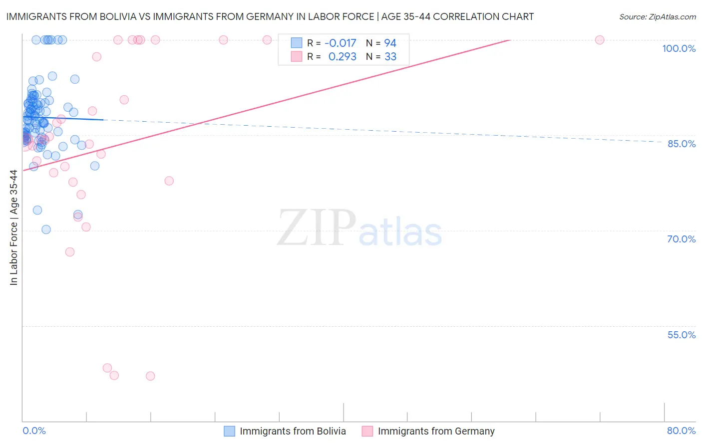 Immigrants from Bolivia vs Immigrants from Germany In Labor Force | Age 35-44 Correlation Chart