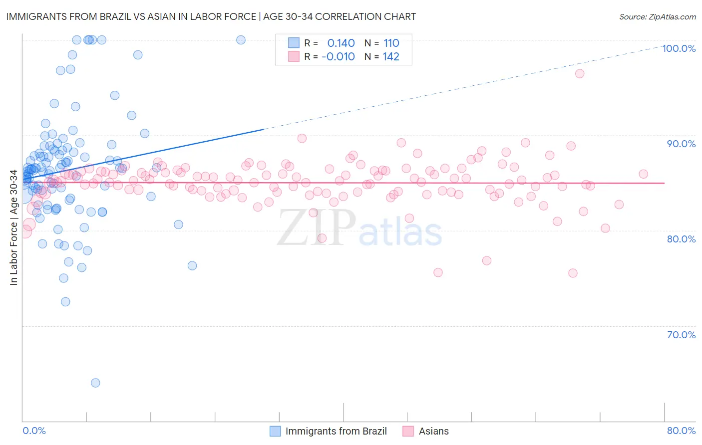 Immigrants from Brazil vs Asian In Labor Force | Age 30-34 Correlation Chart