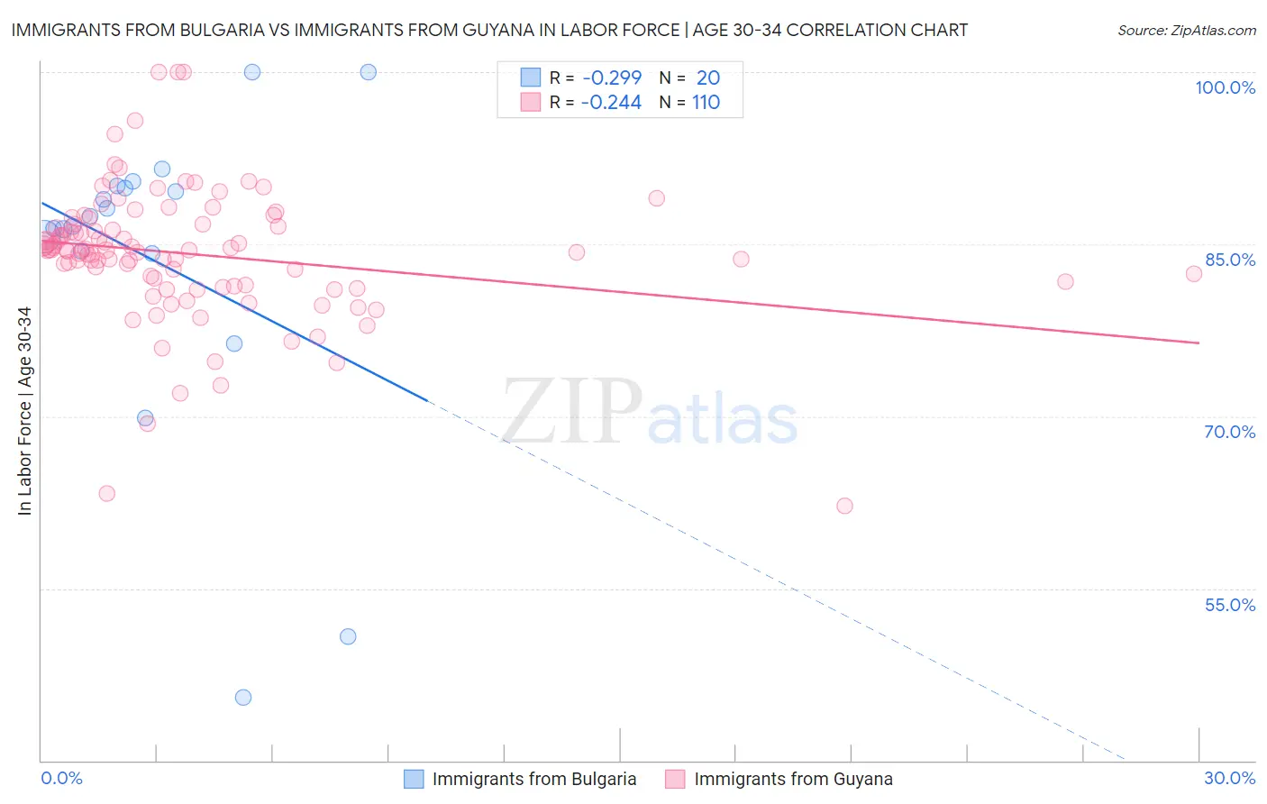 Immigrants from Bulgaria vs Immigrants from Guyana In Labor Force | Age 30-34 Correlation Chart