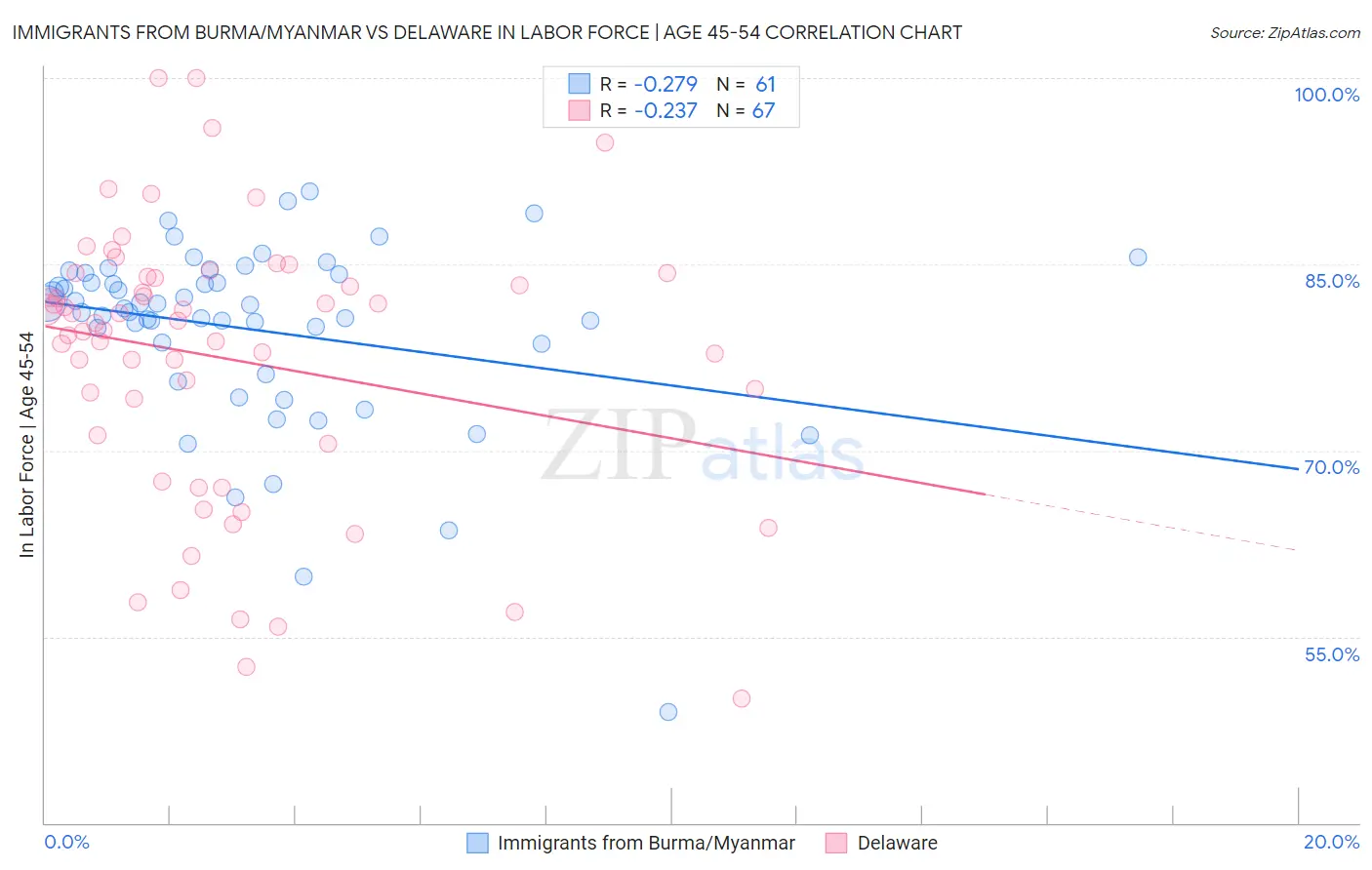 Immigrants from Burma/Myanmar vs Delaware In Labor Force | Age 45-54 Correlation Chart