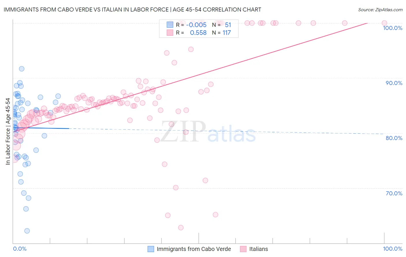Immigrants from Cabo Verde vs Italian In Labor Force | Age 45-54 Correlation Chart