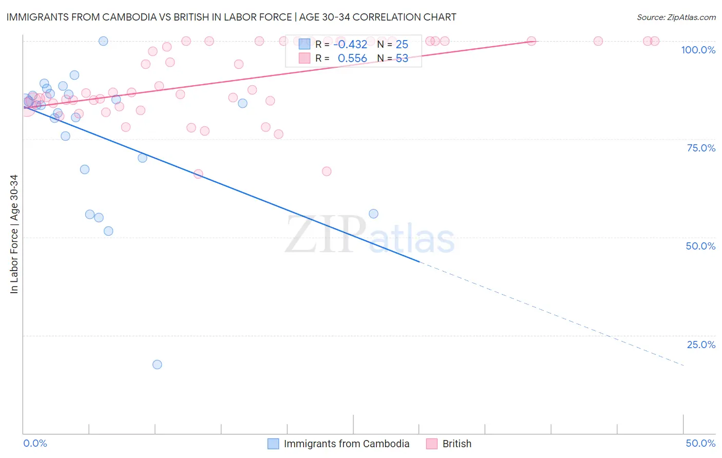 Immigrants from Cambodia vs British In Labor Force | Age 30-34 Correlation Chart