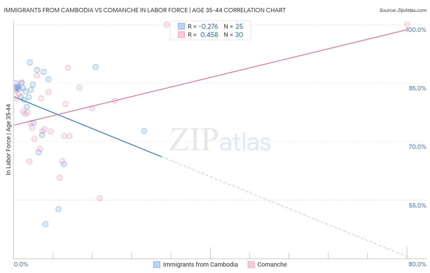 Immigrants from Cambodia vs Comanche In Labor Force | Age 35-44 Correlation Chart