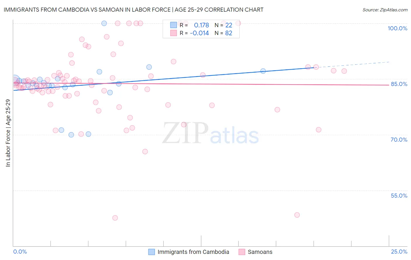 Immigrants from Cambodia vs Samoan In Labor Force | Age 25-29 Correlation Chart