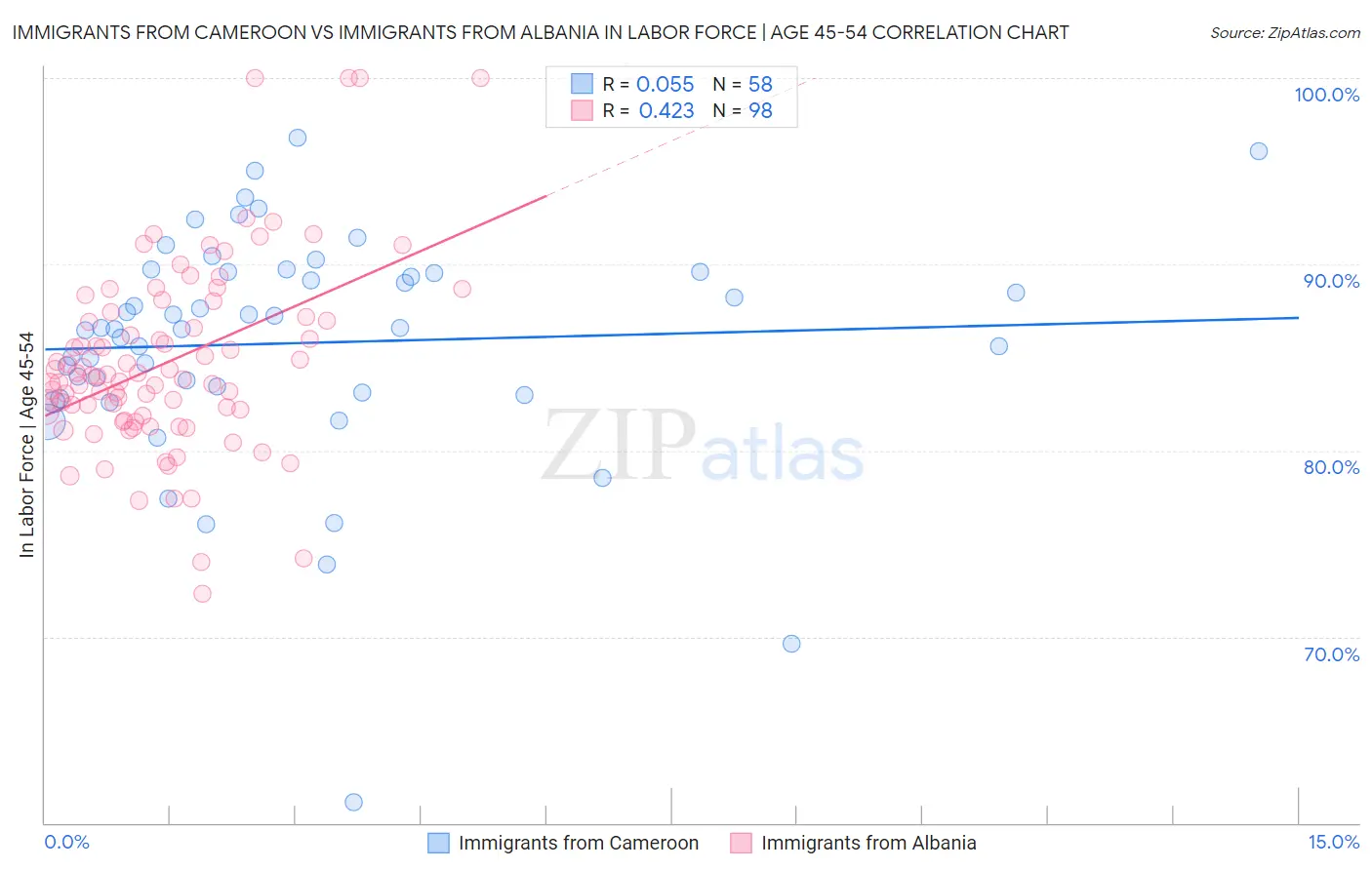 Immigrants from Cameroon vs Immigrants from Albania In Labor Force | Age 45-54 Correlation Chart