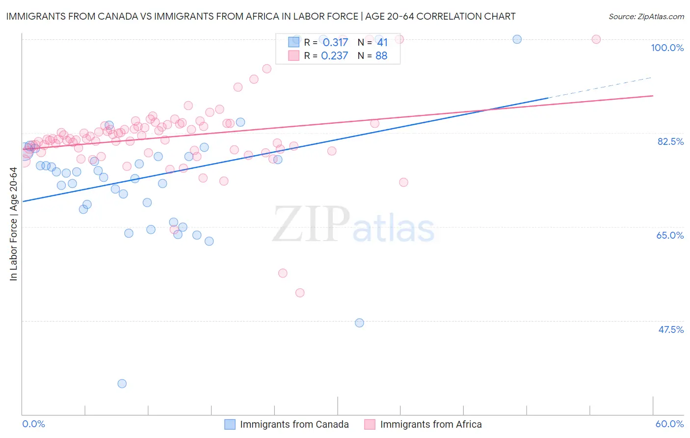 Immigrants from Canada vs Immigrants from Africa In Labor Force | Age 20-64 Correlation Chart