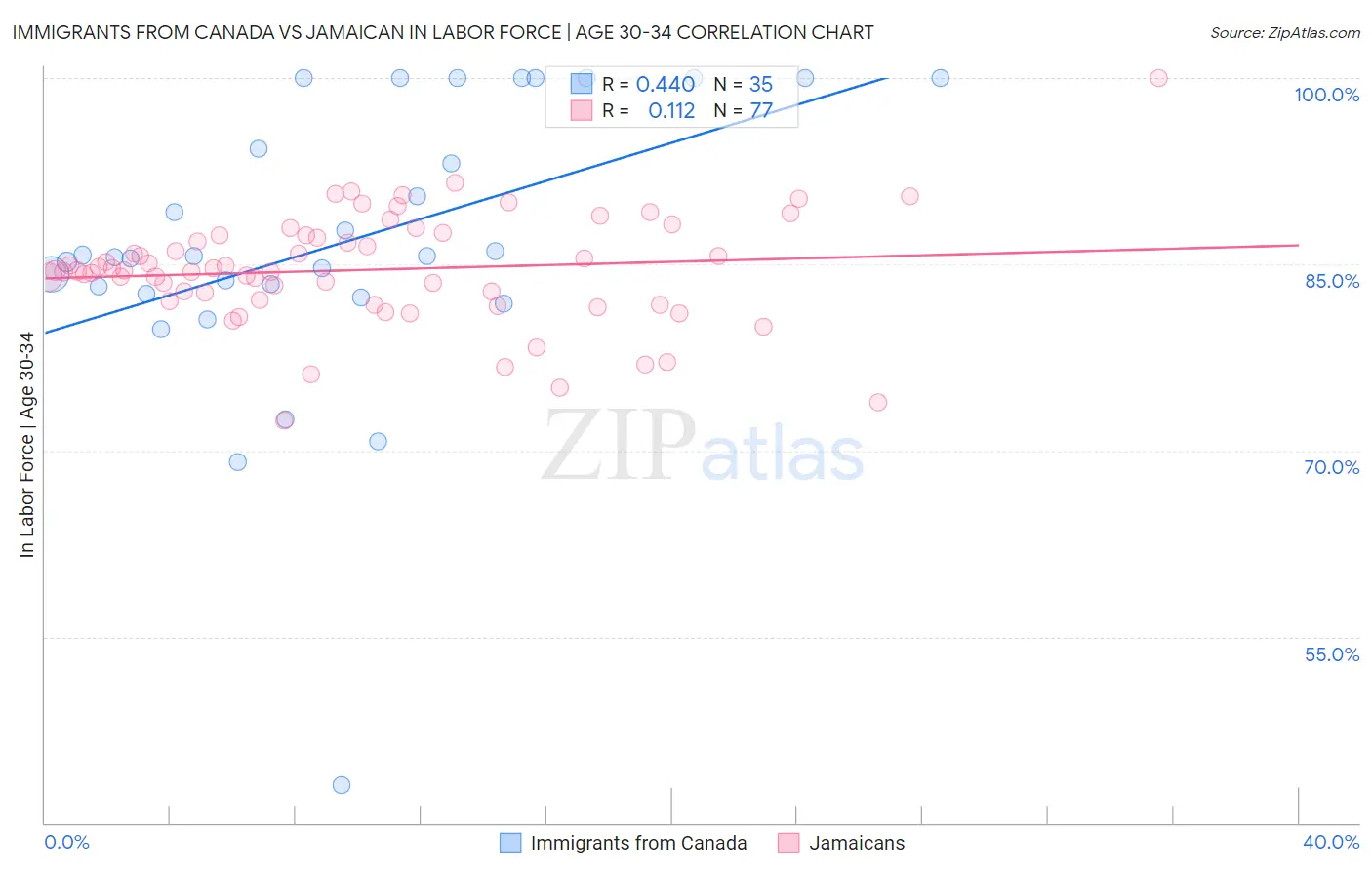Immigrants from Canada vs Jamaican In Labor Force | Age 30-34 Correlation Chart