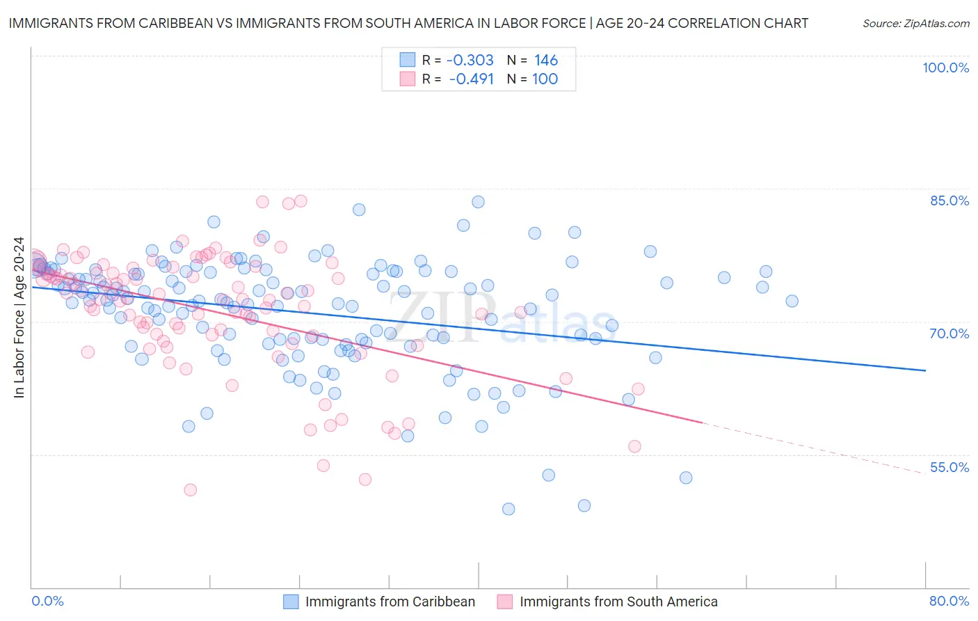 The statistical analysis conducted on geographies consisting of 449,795,737 people shows a mild negative correlation between the proportion of Immigrants from Caribbean and labor force participation rate among population between the ages 20 and 24 in the United States with a correlation coefficient (R) of -0.303 and weighted average of 71.9%. Similarly, the statistical analysis conducted on geographies consisting of 486,128,145 people shows a moderate negative correlation between the proportion of Immigrants from South America and labor force participation rate among population between the ages 20 and 24 in the United States with a correlation coefficient (R) of -0.491 and weighted average of 73.3%, a difference of 2.0%.