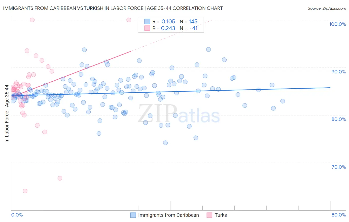 Immigrants from Caribbean vs Turkish In Labor Force | Age 35-44 Correlation Chart