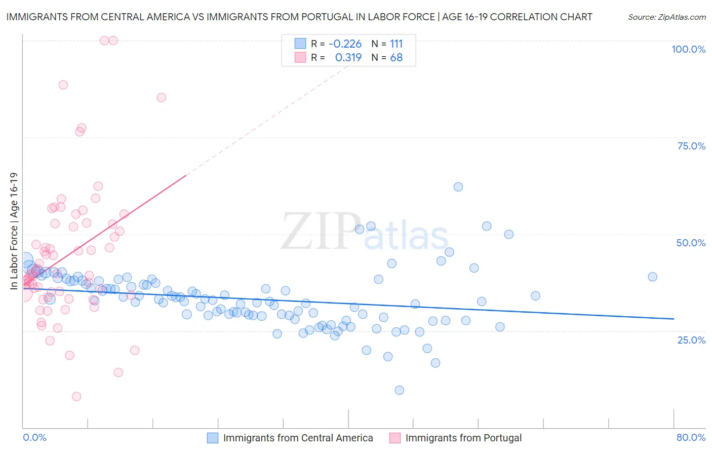 Immigrants from Central America vs Immigrants from Portugal In Labor Force | Age 16-19 Correlation Chart