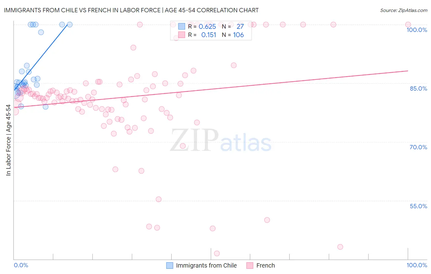 Immigrants from Chile vs French In Labor Force | Age 45-54 Correlation Chart
