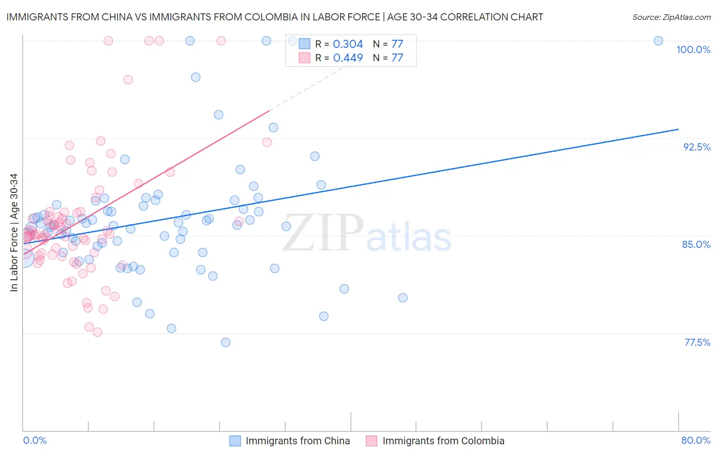 Immigrants from China vs Immigrants from Colombia In Labor Force | Age 30-34 Correlation Chart