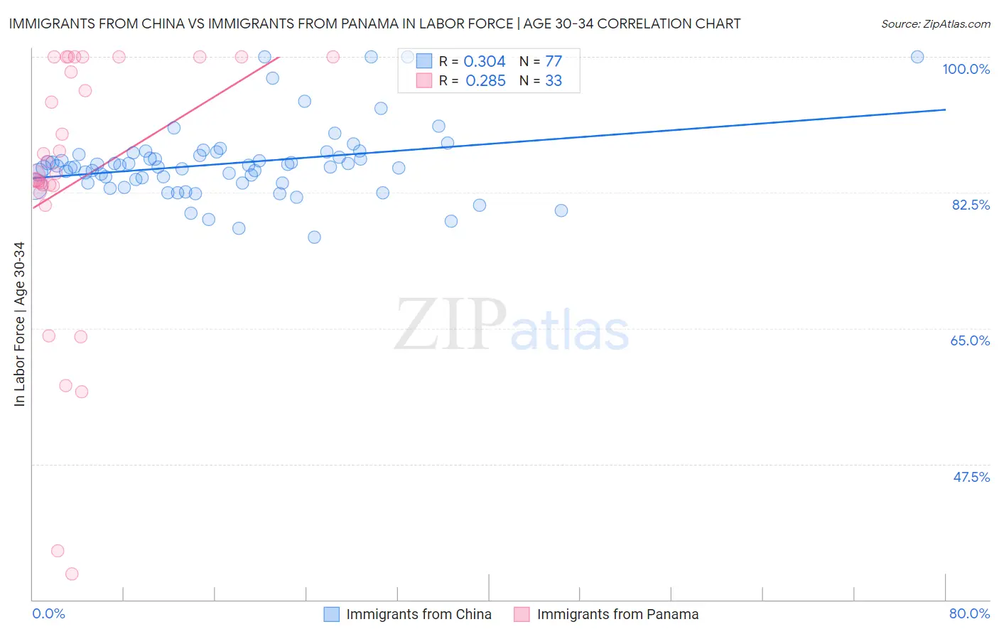 Immigrants from China vs Immigrants from Panama In Labor Force | Age 30-34 Correlation Chart