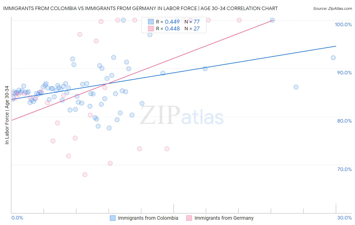 Immigrants from Colombia vs Immigrants from Germany In Labor Force | Age 30-34 Correlation Chart