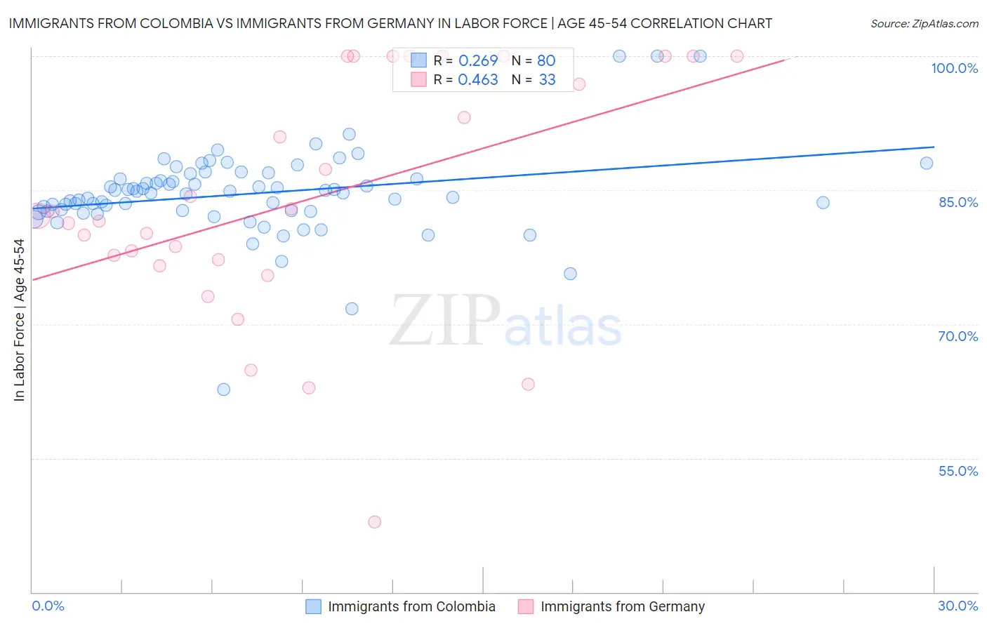 Immigrants from Colombia vs Immigrants from Germany In Labor Force | Age 45-54 Correlation Chart