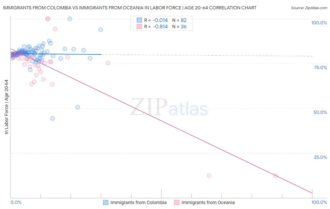 Immigrants from Colombia vs Immigrants from Oceania In Labor Force | Age 20-64 Correlation Chart