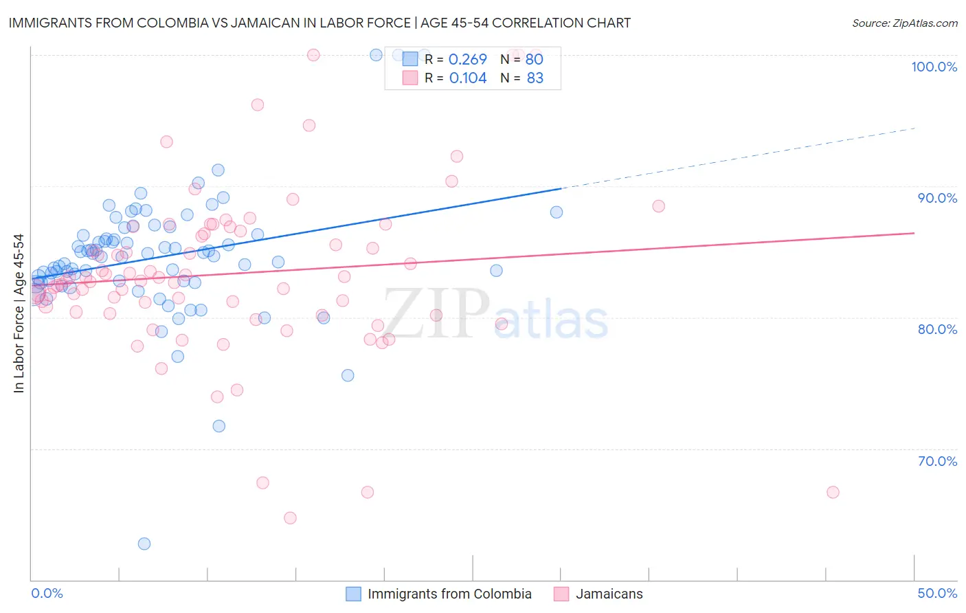 Immigrants from Colombia vs Jamaican In Labor Force | Age 45-54 Correlation Chart