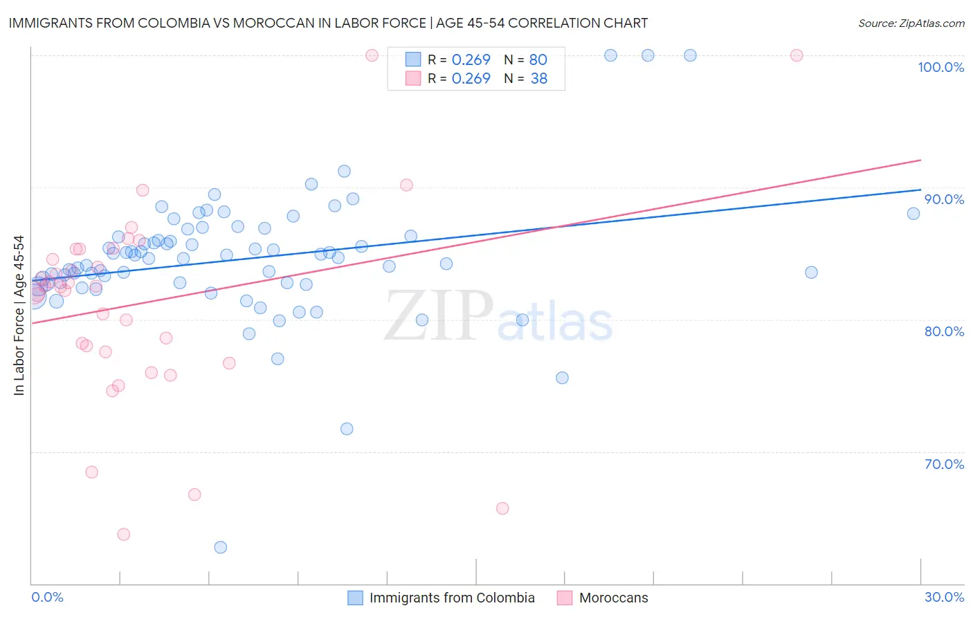 Immigrants from Colombia vs Moroccan In Labor Force | Age 45-54 Correlation Chart