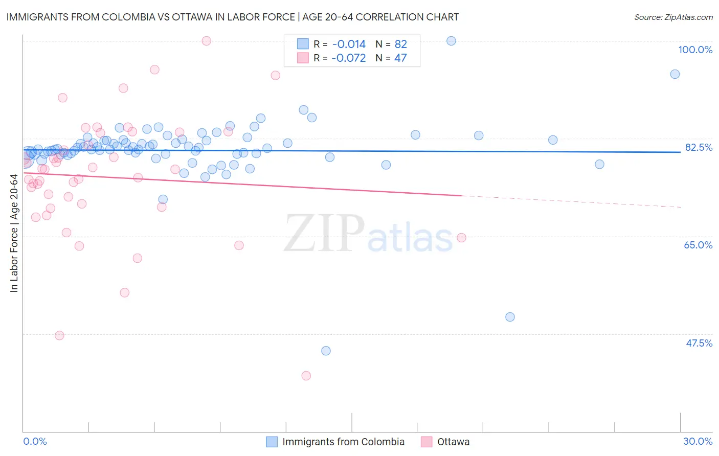 Immigrants from Colombia vs Ottawa In Labor Force | Age 20-64 Correlation Chart