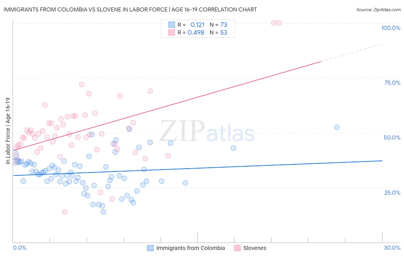 Immigrants from Colombia vs Slovene In Labor Force | Age 16-19 Correlation Chart