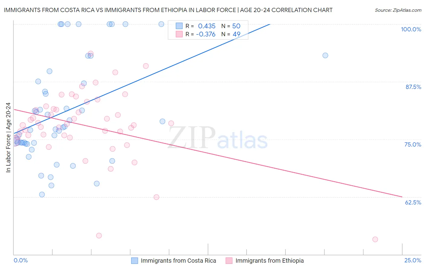 Immigrants from Costa Rica vs Immigrants from Ethiopia In Labor Force | Age 20-24 Correlation Chart