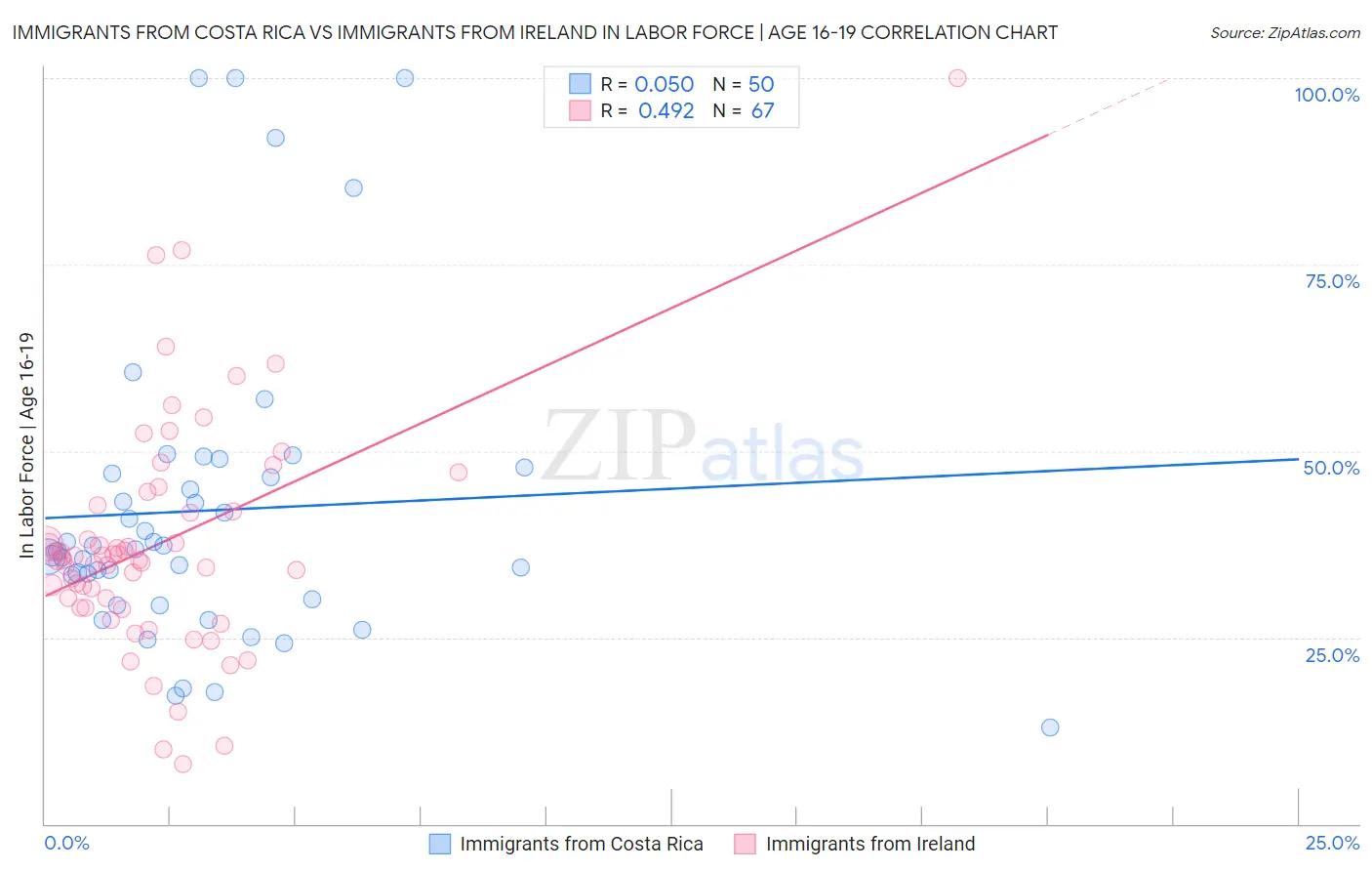 Immigrants from Costa Rica vs Immigrants from Ireland In Labor Force | Age 16-19 Correlation Chart