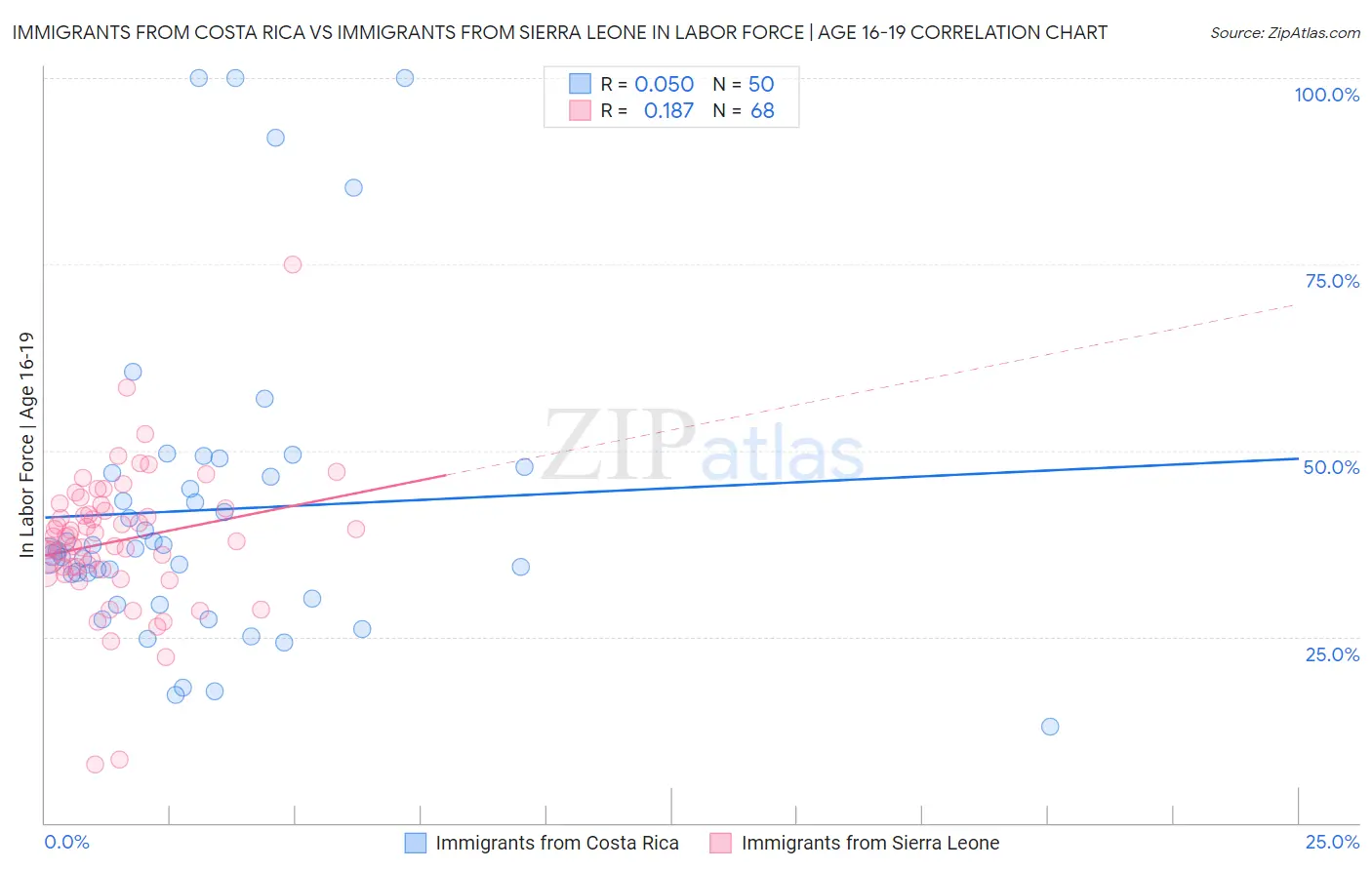 Immigrants from Costa Rica vs Immigrants from Sierra Leone In Labor Force | Age 16-19 Correlation Chart