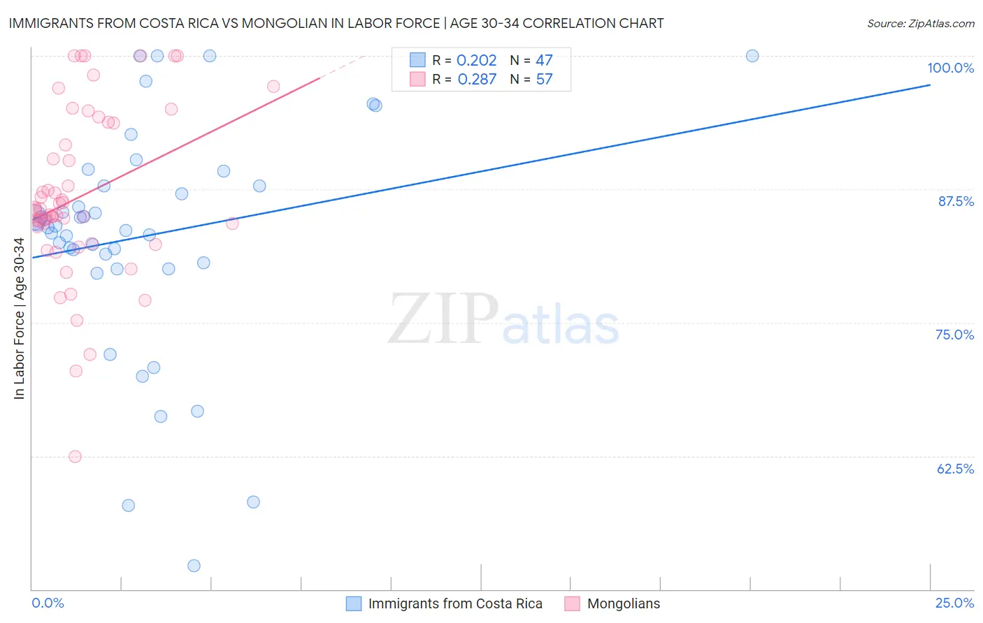 Immigrants from Costa Rica vs Mongolian In Labor Force | Age 30-34 Correlation Chart