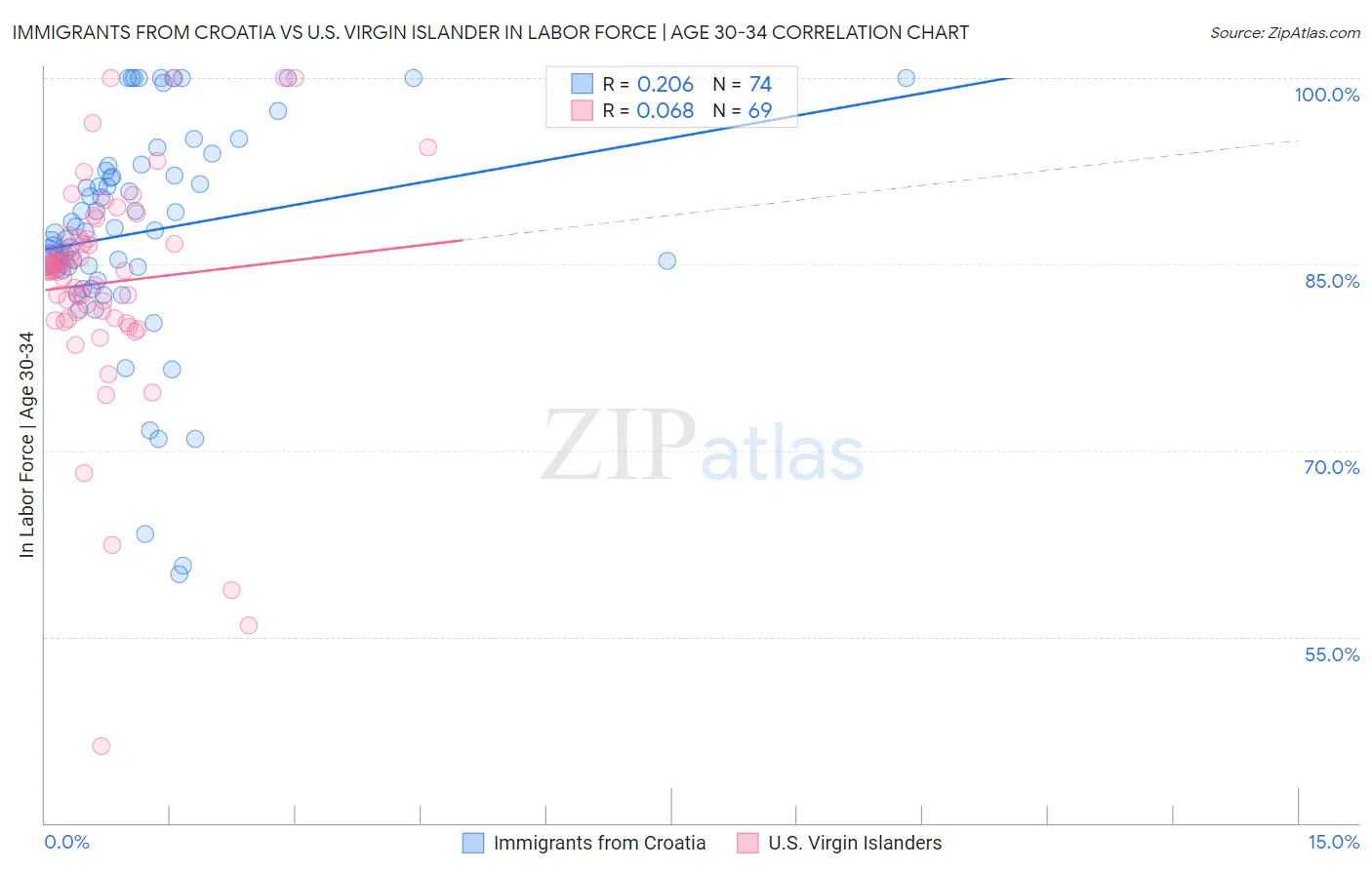 Immigrants from Croatia vs U.S. Virgin Islander In Labor Force | Age 30-34 Correlation Chart