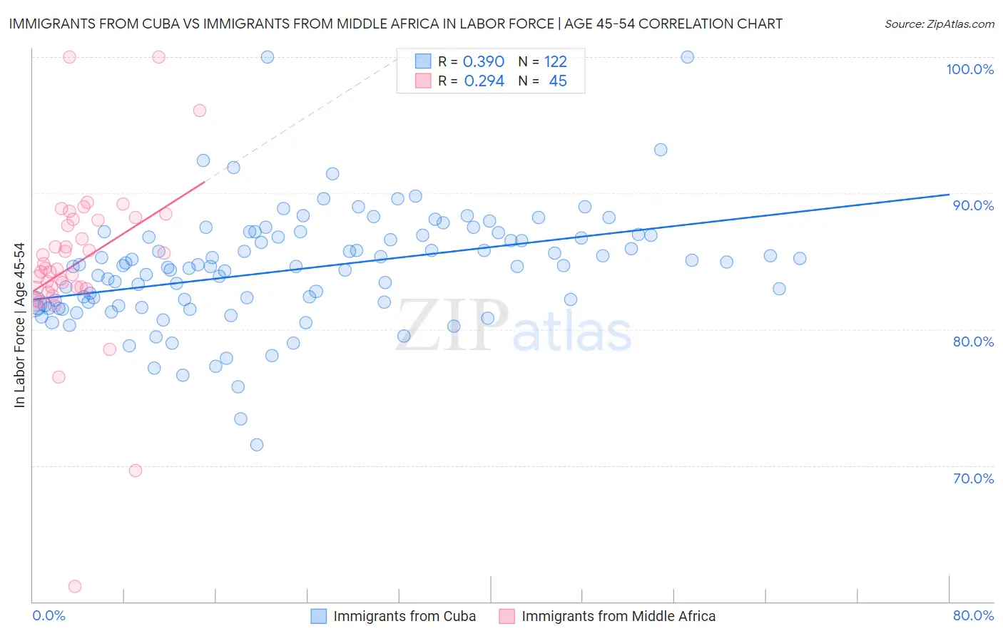 Immigrants from Cuba vs Immigrants from Middle Africa In Labor Force | Age 45-54 Correlation Chart