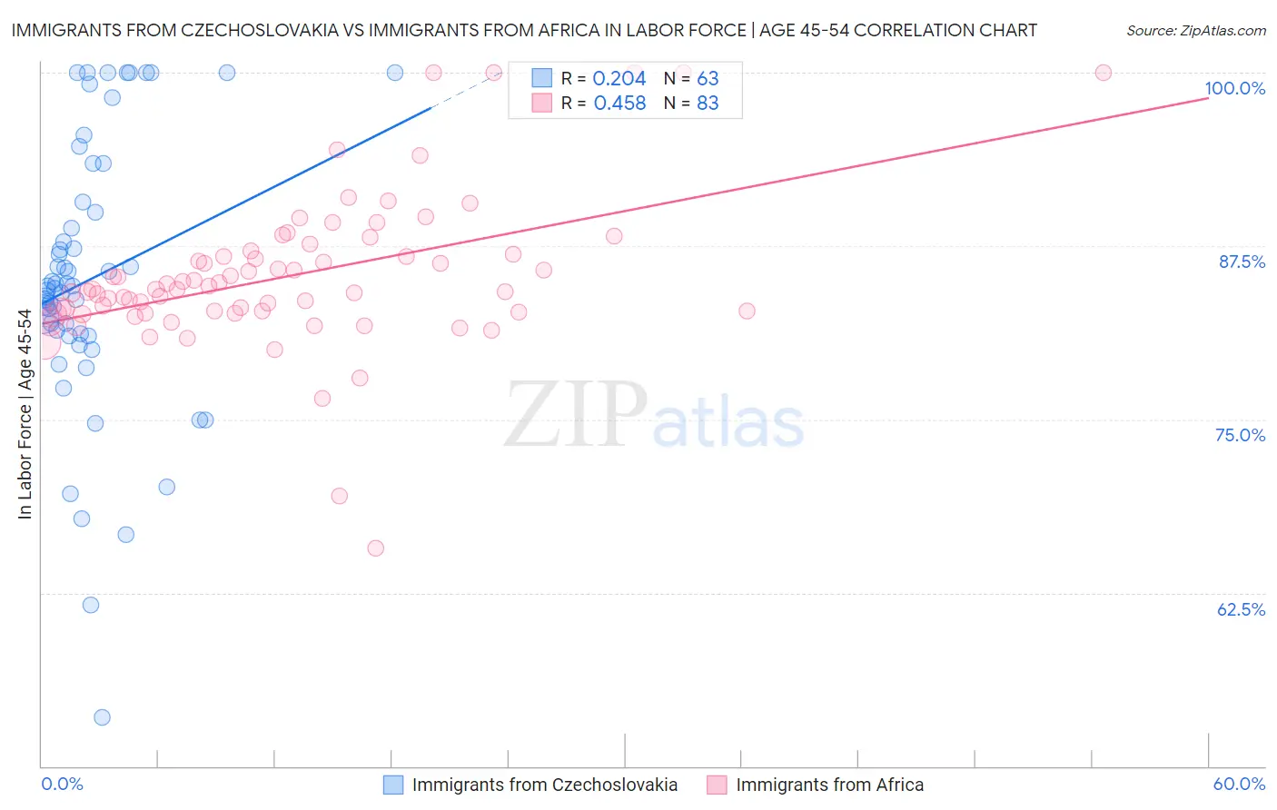 Immigrants from Czechoslovakia vs Immigrants from Africa In Labor Force | Age 45-54 Correlation Chart