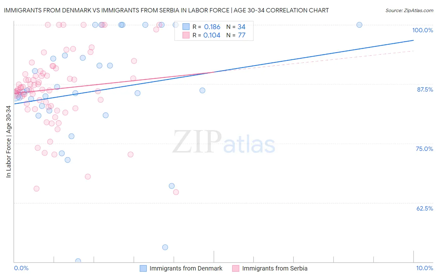 Immigrants from Denmark vs Immigrants from Serbia In Labor Force | Age 30-34 Correlation Chart