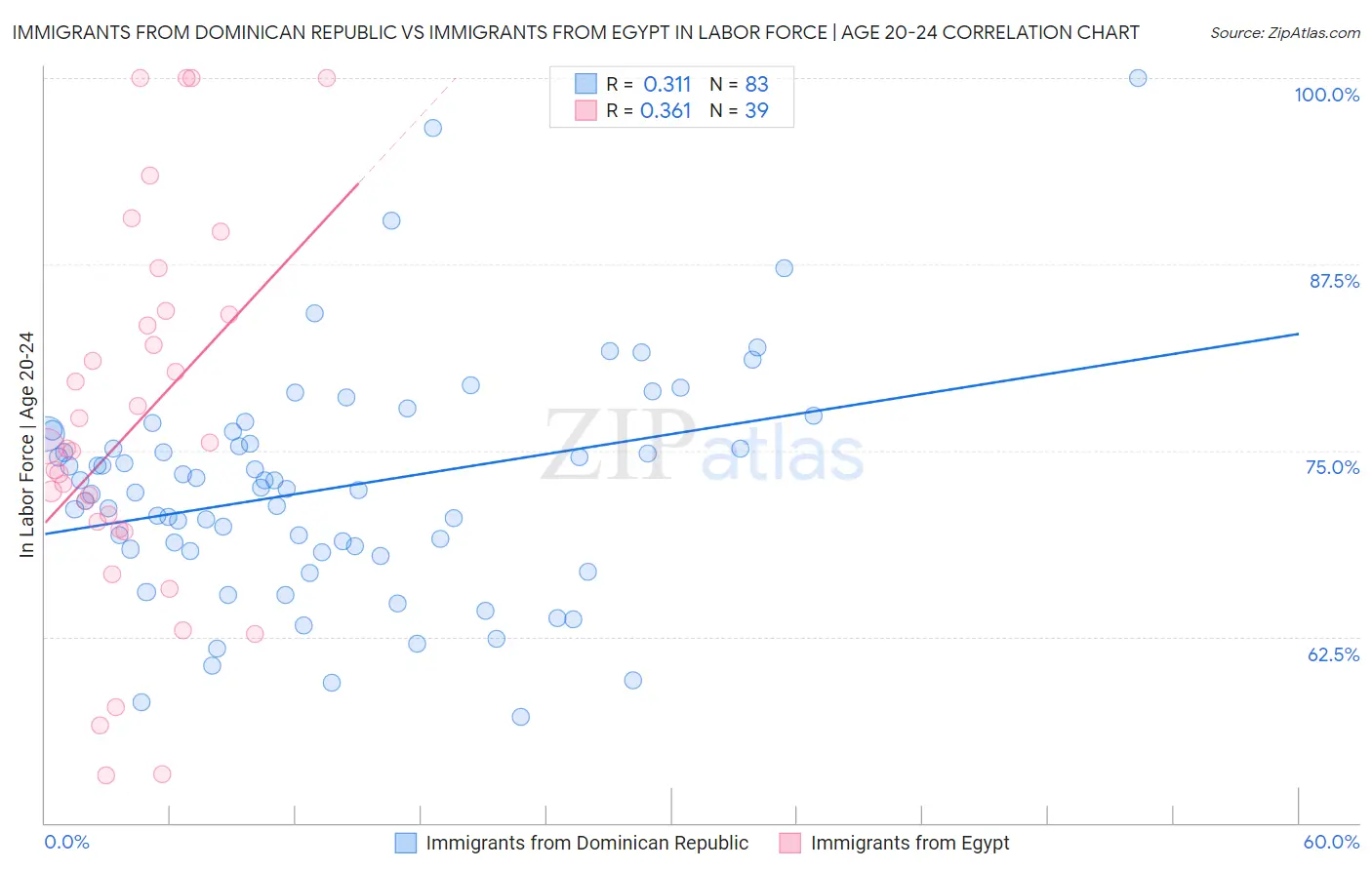 Immigrants from Dominican Republic vs Immigrants from Egypt In Labor Force | Age 20-24 Correlation Chart