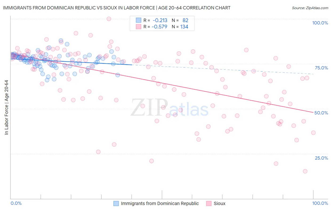 Immigrants from Dominican Republic vs Sioux In Labor Force | Age 20-64 Correlation Chart
