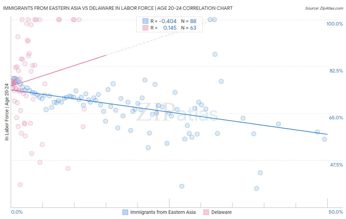 Immigrants from Eastern Asia vs Delaware In Labor Force | Age 20-24 Correlation Chart