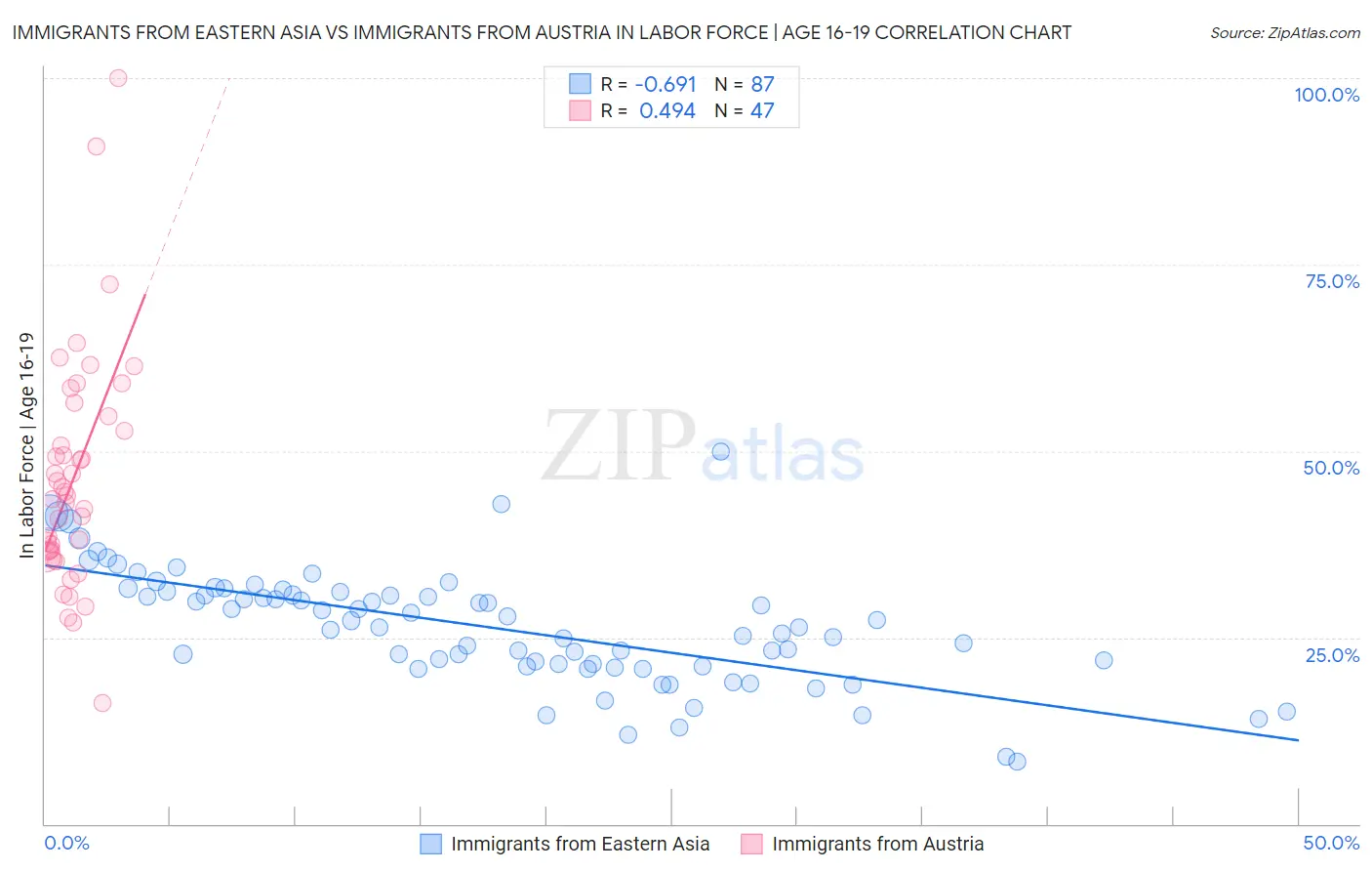 Immigrants from Eastern Asia vs Immigrants from Austria In Labor Force | Age 16-19 Correlation Chart