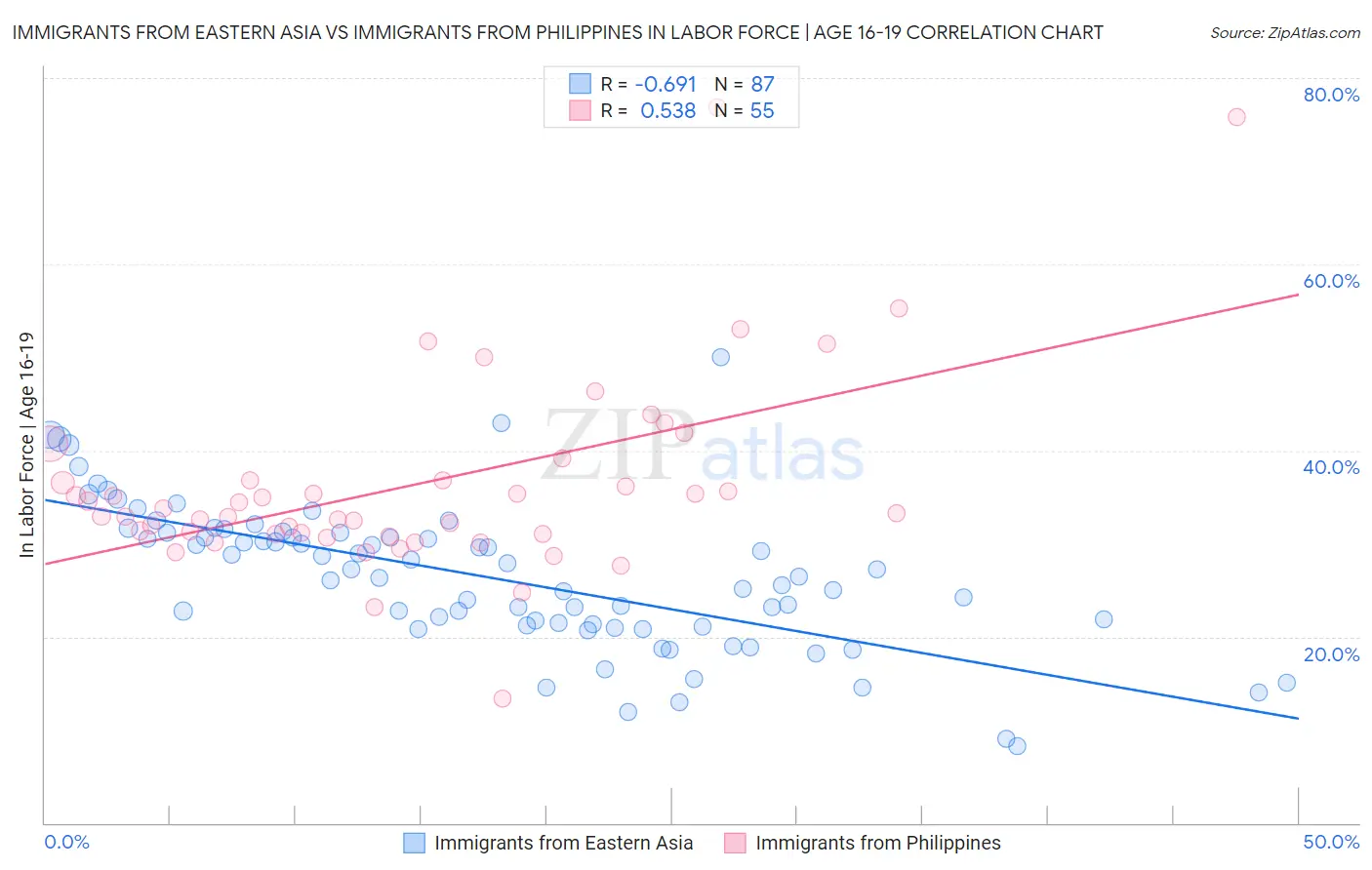 Immigrants from Eastern Asia vs Immigrants from Philippines In Labor Force | Age 16-19 Correlation Chart