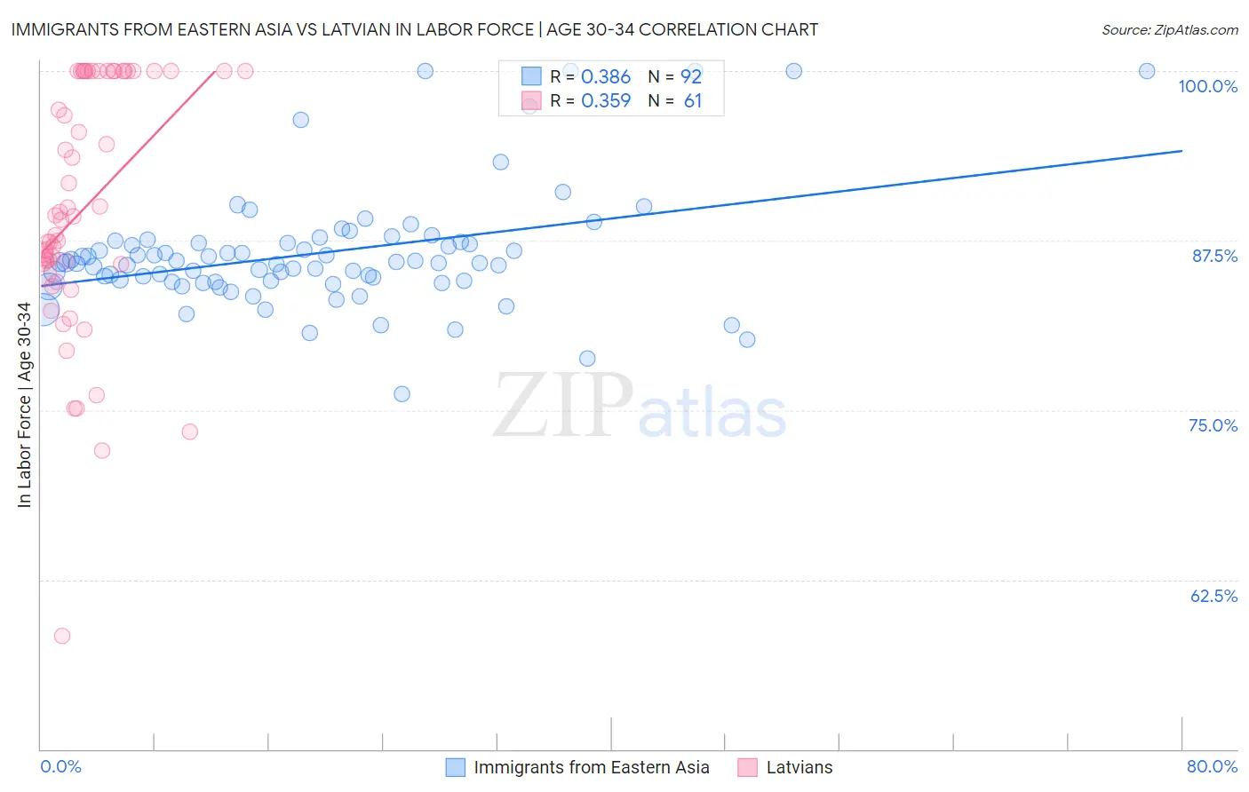 Immigrants from Eastern Asia vs Latvian In Labor Force | Age 30-34 Correlation Chart