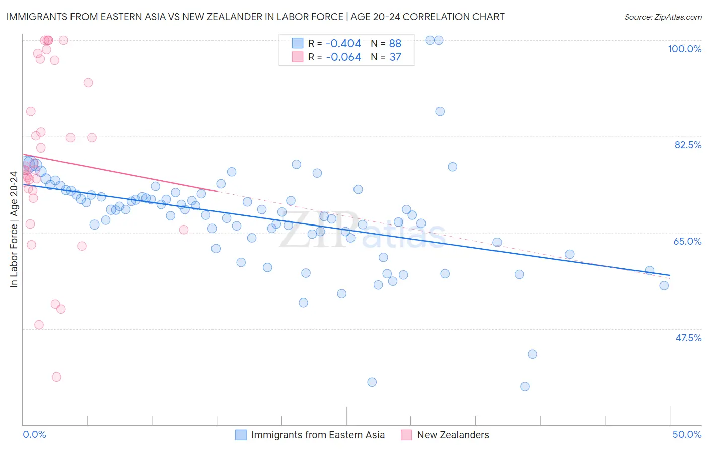 Immigrants from Eastern Asia vs New Zealander In Labor Force | Age 20-24 Correlation Chart