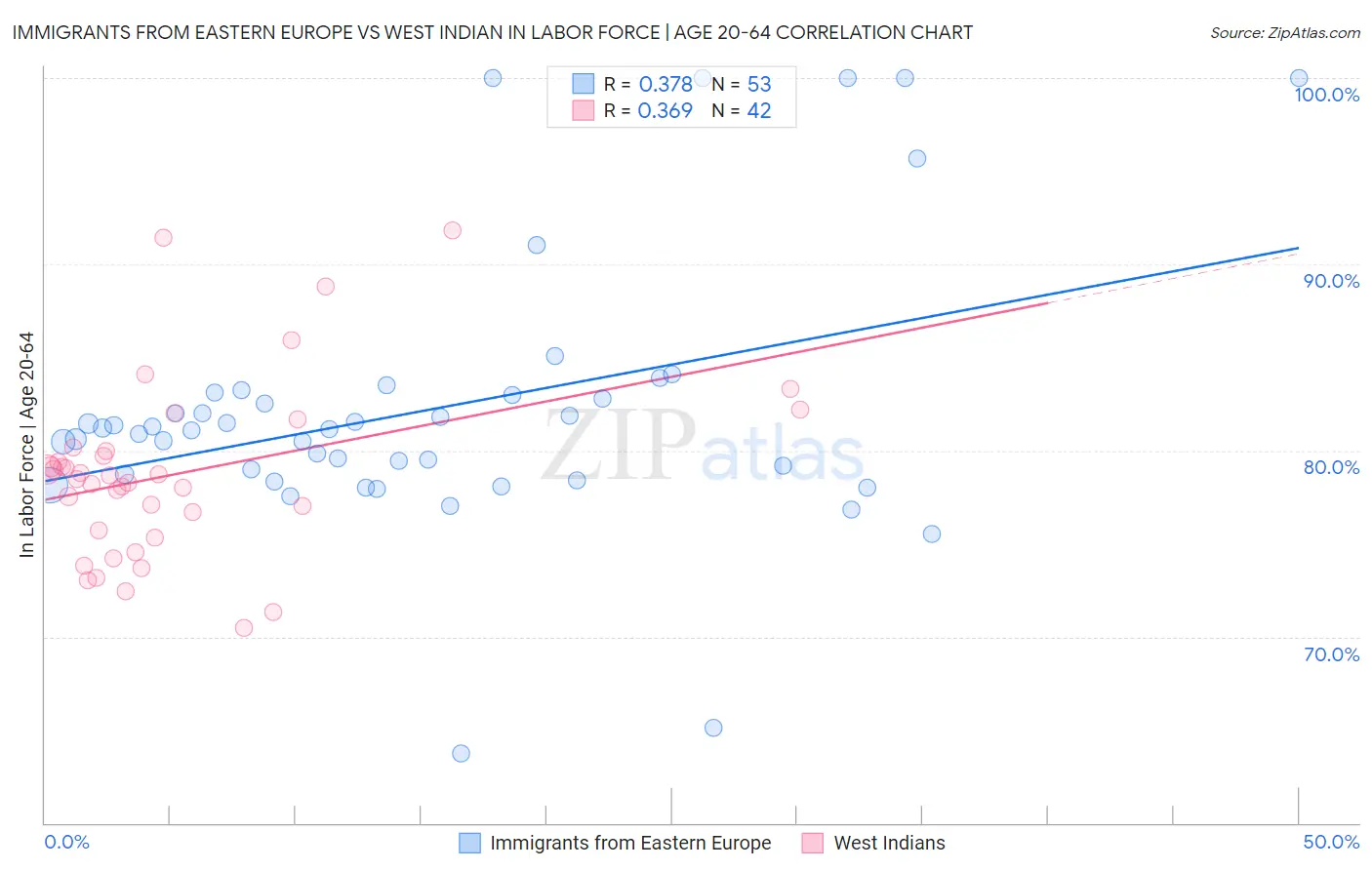 The statistical analysis conducted on geographies consisting of 475,884,691 people shows a mild positive correlation between the proportion of Immigrants from Eastern Europe and labor force participation rate among population between the ages 20 and 64 in the United States with a correlation coefficient (R) of 0.378 and weighted average of 80.2%. Similarly, the statistical analysis conducted on geographies consisting of 254,049,696 people shows a mild positive correlation between the proportion of West Indians and labor force participation rate among population between the ages 20 and 64 in the United States with a correlation coefficient (R) of 0.369 and weighted average of 78.3%, a difference of 2.4%.